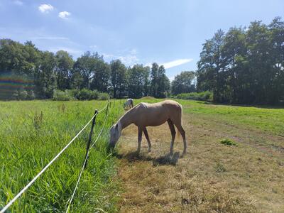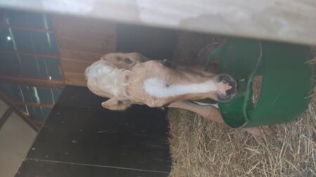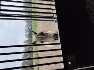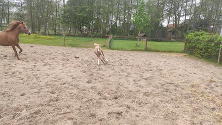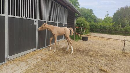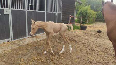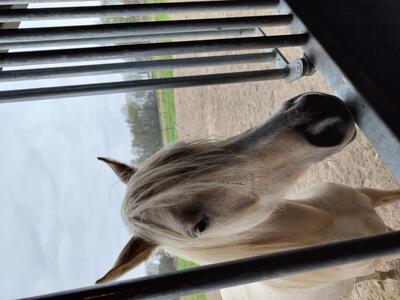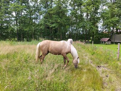 Nieuwsgierige, zelfstandige en dappere merrie met een goede balans en verende gangen. Houdt van poetsen, aandacht en samen wat doen. Palomino met 4 witte benen.Allround E-pony. Bij mij geboren en gezond. Ik fok hobbymatig, daarom nu beschikbaar voor een fijn thuis. Wordt begin mei 3 jaar. 80% arabisch bloed. Predikaatrijke moederlijn met o.a. de top ox hengsten Krimh, Gomel en Baccarat.Braaf bij de smid en loopt netjes mee, ook over balkjes of een zeiltje. Trailer kent ze nog niet maar ik kan haar brengen. Gewend aan 24/7 buiten of 's nachts op stal. Filmpjes beschikbaar op aanvraag.